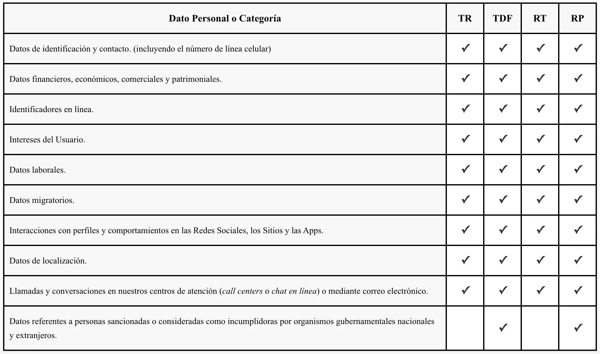 En caso de que haya proporcionado datos de contacto de terceros como referencias, autorizados, cotitulares, cónyuges, beneficiarios, coacreditados, referencias, garantes, obligados solidarios, avales, fiadores, tutores, proveedores, beneficiarios y demás figuras legales relacionadas con productos y/o servicios de los Responsables, Usted garantiza que cuenta con su autorización para proporcionar dichos datos, incluyendo en su caso los datos personales aplicables, y es responsable de comunicar a dichas personas sobre los términos y razones por las cuales los contactaremos y, en su caso, el Tratamiento de sus datos personales conforme al presente Aviso de Privacidad, así como los medios para conocer el contenido íntegro del mismo. Adicionalmente, mediante su consentimiento al presente Aviso de Privacidad, usted ratifica su autorización para que los Responsables para que contacte a dichas personas.